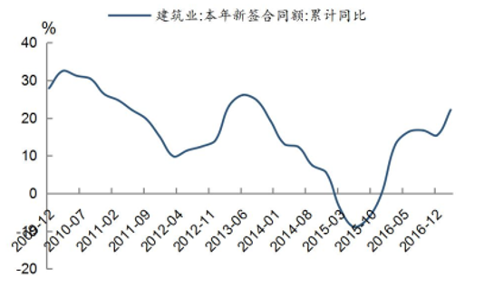 截至 2017, 建筑業(yè)總產(chǎn)值增速為 10.82%, 較 2016 年全年 7.09%的增速提升3.74 個百分點, 主要因為今年以來, 基建投資、 房地產(chǎn)投資都保持了較快增長,行業(yè)景氣度有所上升。截至 1Q2017, 建筑業(yè)本年新簽合同額累計同比增長 22.17%, 達到近三年來最高水平, 較 2016 年全年增速 15.38%提高 6.79 個百分點, 較去年同期提高 9.26個百分點, 顯示需求一定程度的持續(xù)回暖。