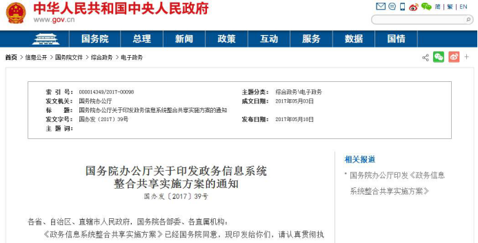 2017年5月,國務(wù)院辦公廳下發(fā)《關(guān)于印發(fā)政務(wù)信息系統(tǒng)整合共享實施方案的通知》(國辦發(fā)〔2017〕39號)。要求: